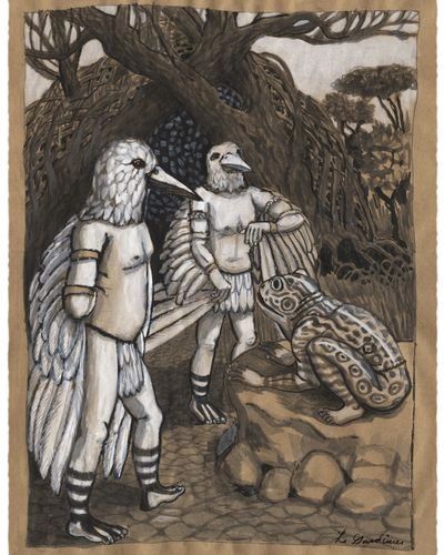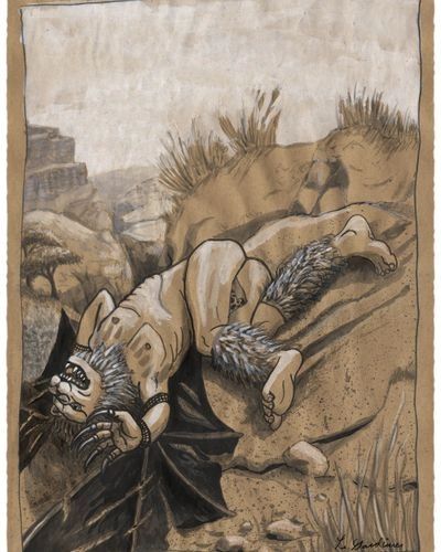 “He sprang towards them, but now that they knew he couldn’t fly they were not afraid of him. They flew away and sailed round in the air over his head, just too high for him to reach, and they called out: ‘Ha! ha! ha! Oom cannot catch us! The bones are broken, and his wings are useless. Now men and animals can live again. We will fly away and tell them the good news.’